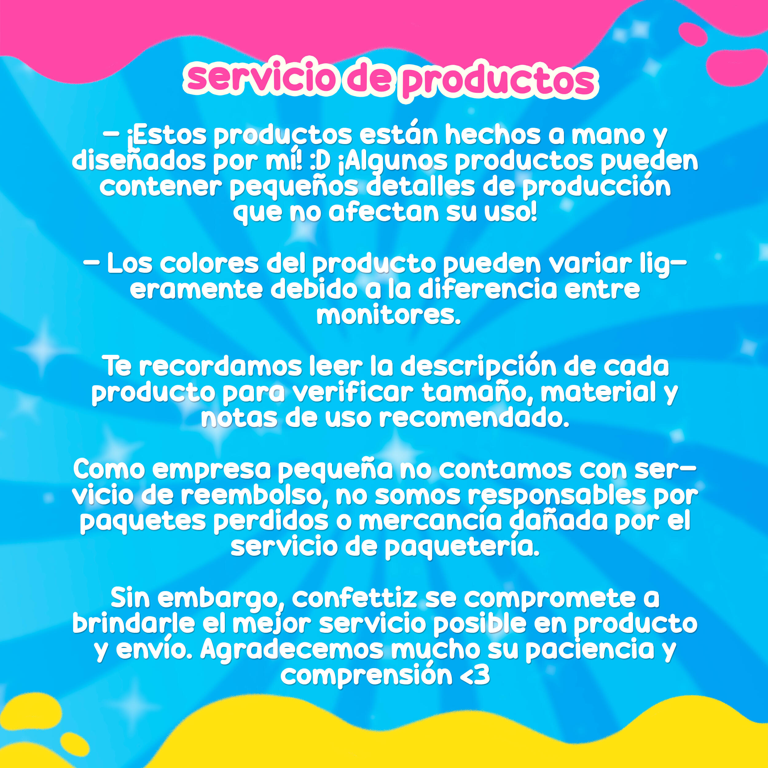 Every product is handmade with care and creativity, often designed, printed, and assembled by me. Behind each item is my passion for character design and self-expression. Inspired by Sanrio and other mascot-based brands, I created a cast of original characters, each representing different modern aesthetics. The idea is that everyone can find a character to relate to—whether they see themselves in one, or mix styles and connect with several at once.Confettiz is currently run by me (the creator and artist behind the project), but every character plays a symbolic “role” in the shop’s identity. Over time, I hope the brand grows to include clothing and plushies—the original dream—and becomes a place where people feel safe, happy, and proud of their unique style.At its heart, Confettiz is about celebrating individuality, creativity, and freedom of expression. It’s a brand made with love, color, and the belief that the world is better when we dare to be ourselves. 🌈✨